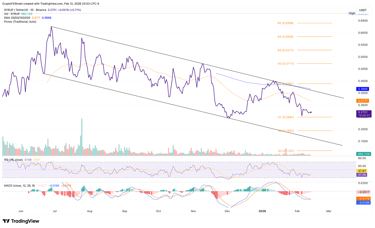 - SYRUP se mantiene por encima de 0.2700$ el viernes, insinuando un posible rebote dentro de un patrón de canal descendente más amplio.