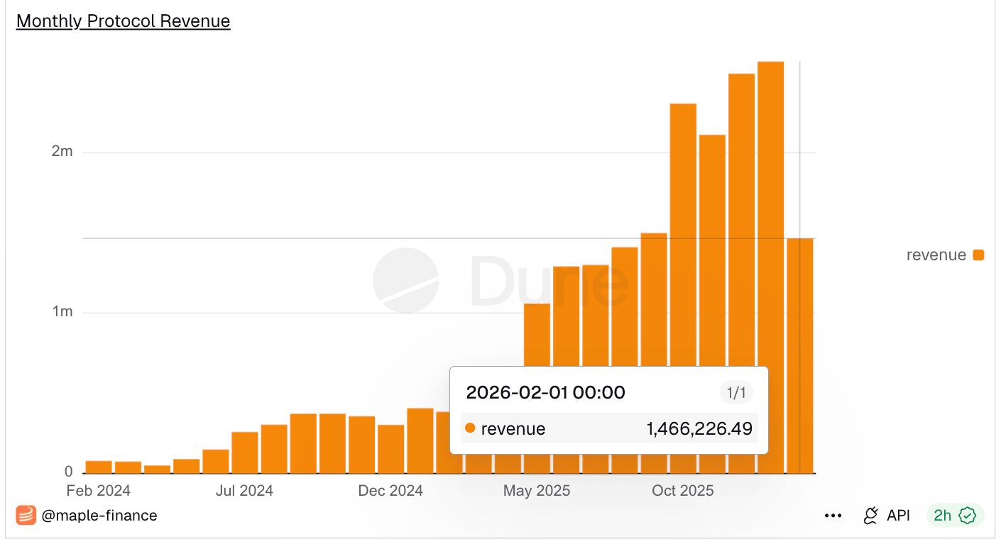 Los datos del panel de Dune indican que Maple Finance registró ingresos de 1.46 millones de dólares hasta ahora este mes, después de alcanzar un récord de 2.57 millones de dólares en ingresos, principalmente de tarifas de préstamos y optimización de rendimiento. Esto refleja un aumento constante en los ingresos mensuales, construyendo sobre los 2.49 millones de dólares recaudados en diciembre.