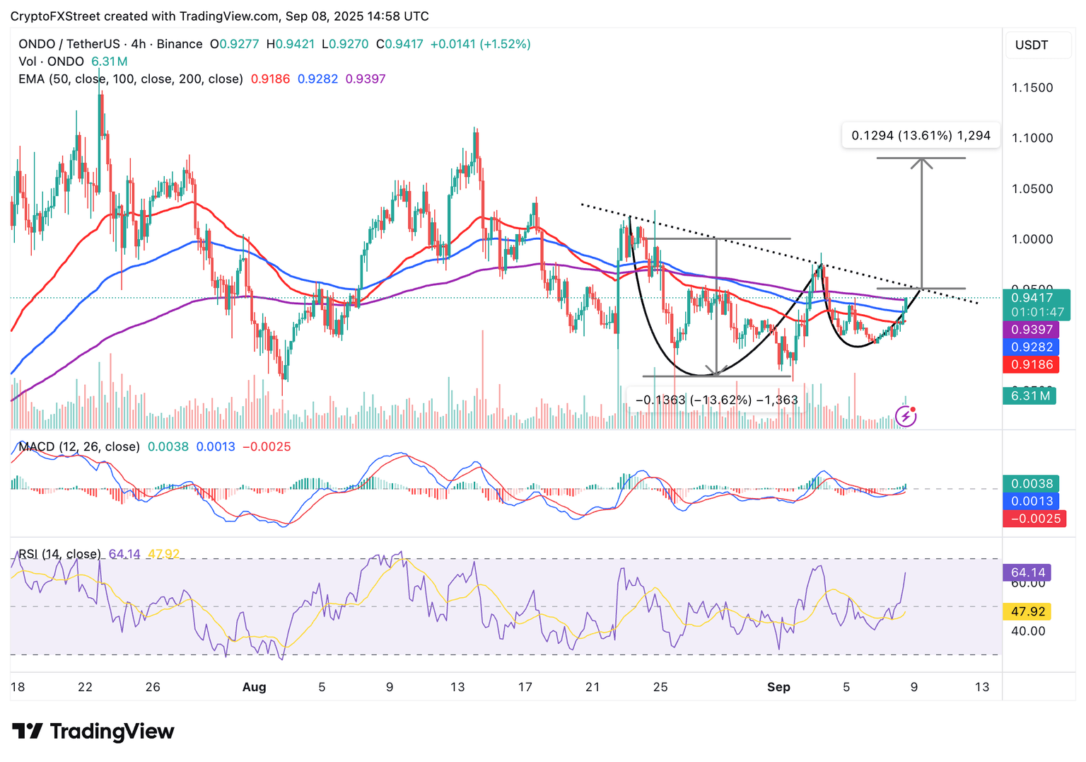 Ondo se mantiene por encima de la media móvil exponencial (EMA) de 100 períodos en 0.92$ en el gráfico de 4 horas. Al mismo tiempo, los alcistas están presionando para romper la resistencia de la EMA de 200 períodos en 0.93$ para allanar el camino hacia un breakout del patrón taza con asa.