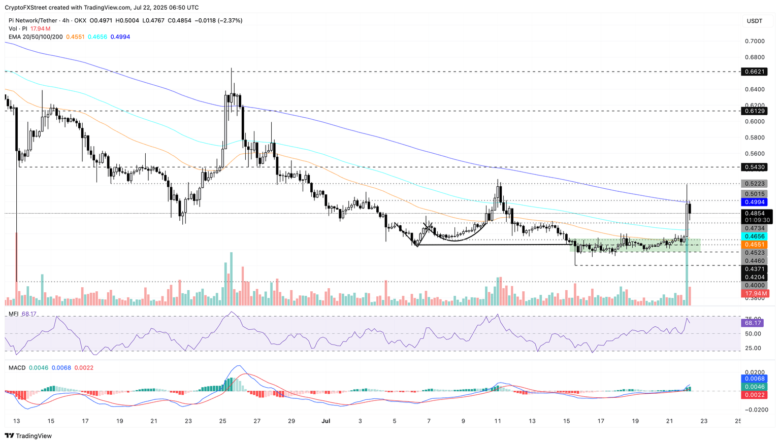 Pi Network rompe un rango de consolidación para probar la media móvil exponencial (EMA) de 200 periodos en el gráfico de 4 horas en 0.4994$. PI marca un máximo de 24 horas de 0.5215$, pero no logra cerrar una vela por encima de la EMA de 200 periodos, resultando en un ligero retroceso.