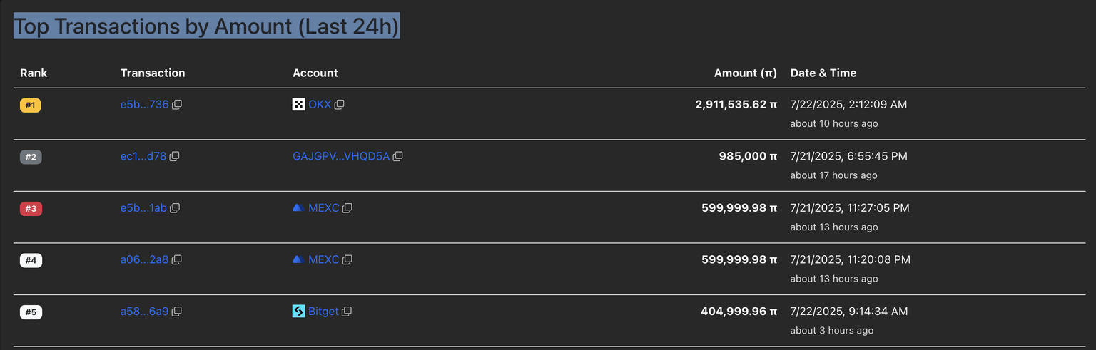 Los datos de PiScan de las transacciones más grandes en las últimas 24 horas muestran dos transacciones de alto valor de 599.999 tokens PI desde el intercambio MEXC a Gate.io y OKX intercambios. De manera similar, Bitget depositó 404.999 tokens PI en Gate.io. Las salidas de MEXC y Bitget sugieren una posible venta masiva o una redistribución estratégica de tokens PI.