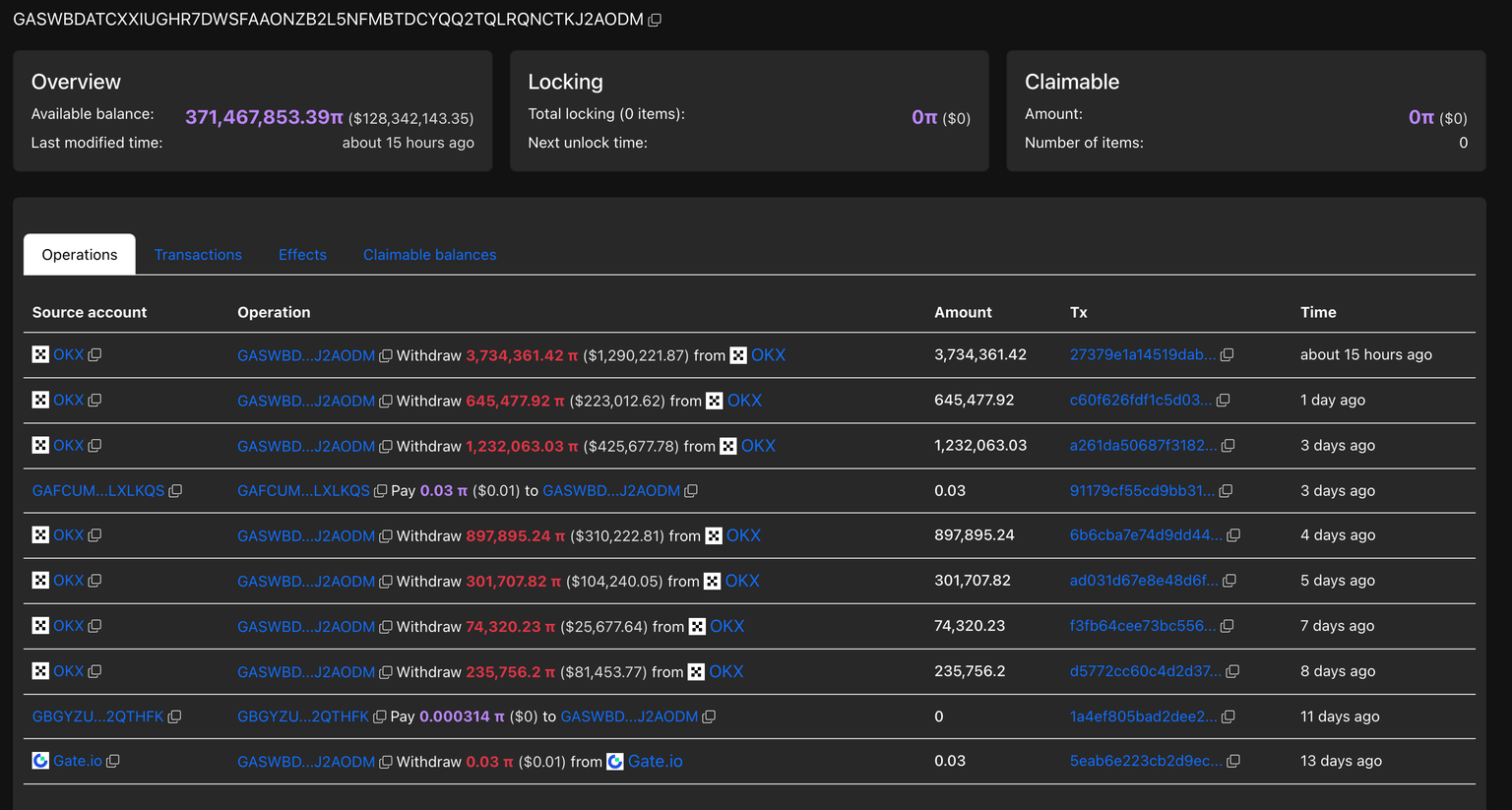 Los datos de PiScan muestran que un gran inversor de billetera, comúnmente referido como ballena, retiró 3.73 millones de tokens PI de la plataforma OKX el lunes, ampliando la tenencia a 371 millones de tokens.
