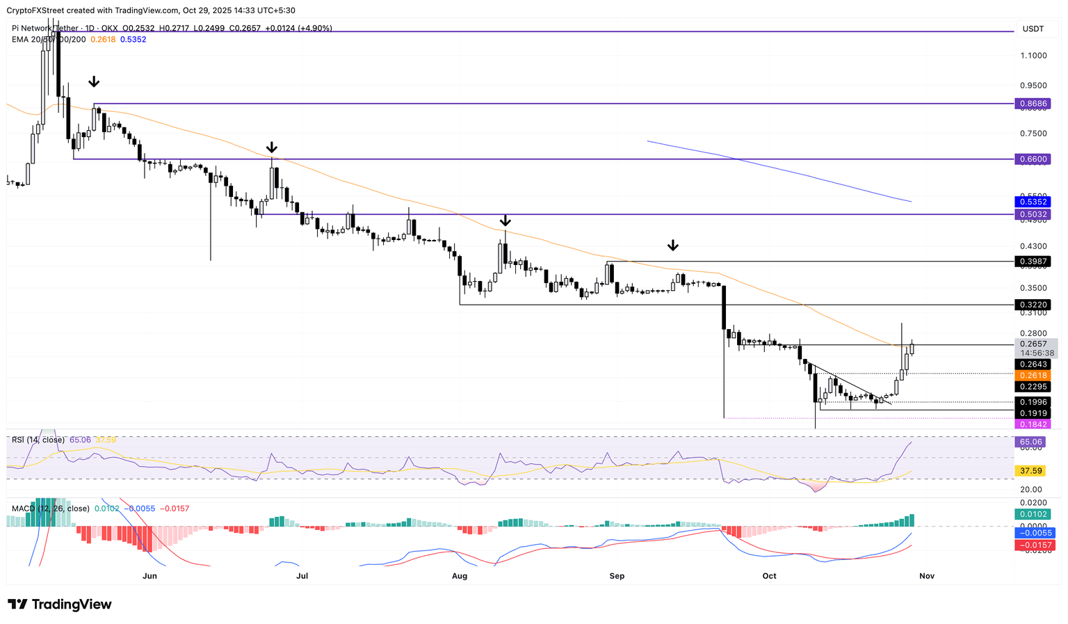 - Pi Network se recupera por encima de la EMA de 50 días, preparando una posible recuperación.