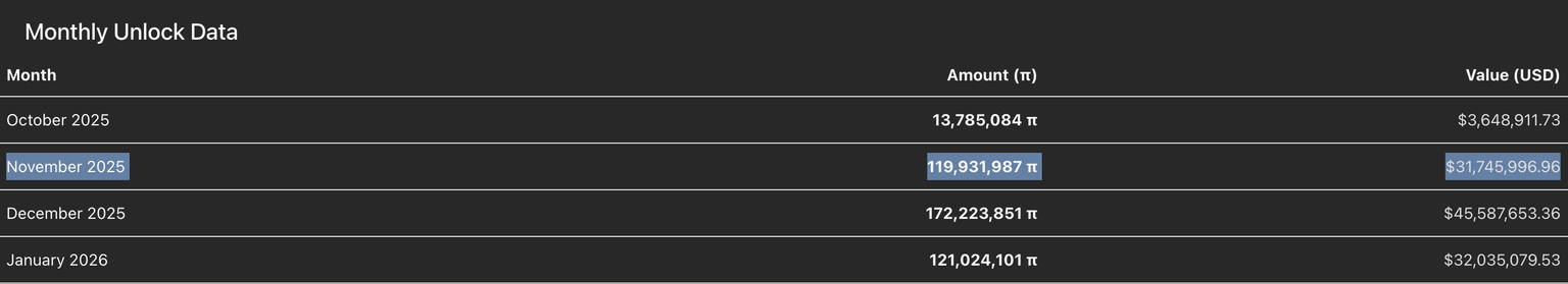 Por otro lado, el calendario de desbloqueo de tokens de PiScan indica que 119,93 millones de PI se liberarán en noviembre. Este desbloqueo, junto con el aumento de entradas en los CEXs, podría intensificar los vientos en contra que enfrenta la recuperación actual del token PI.