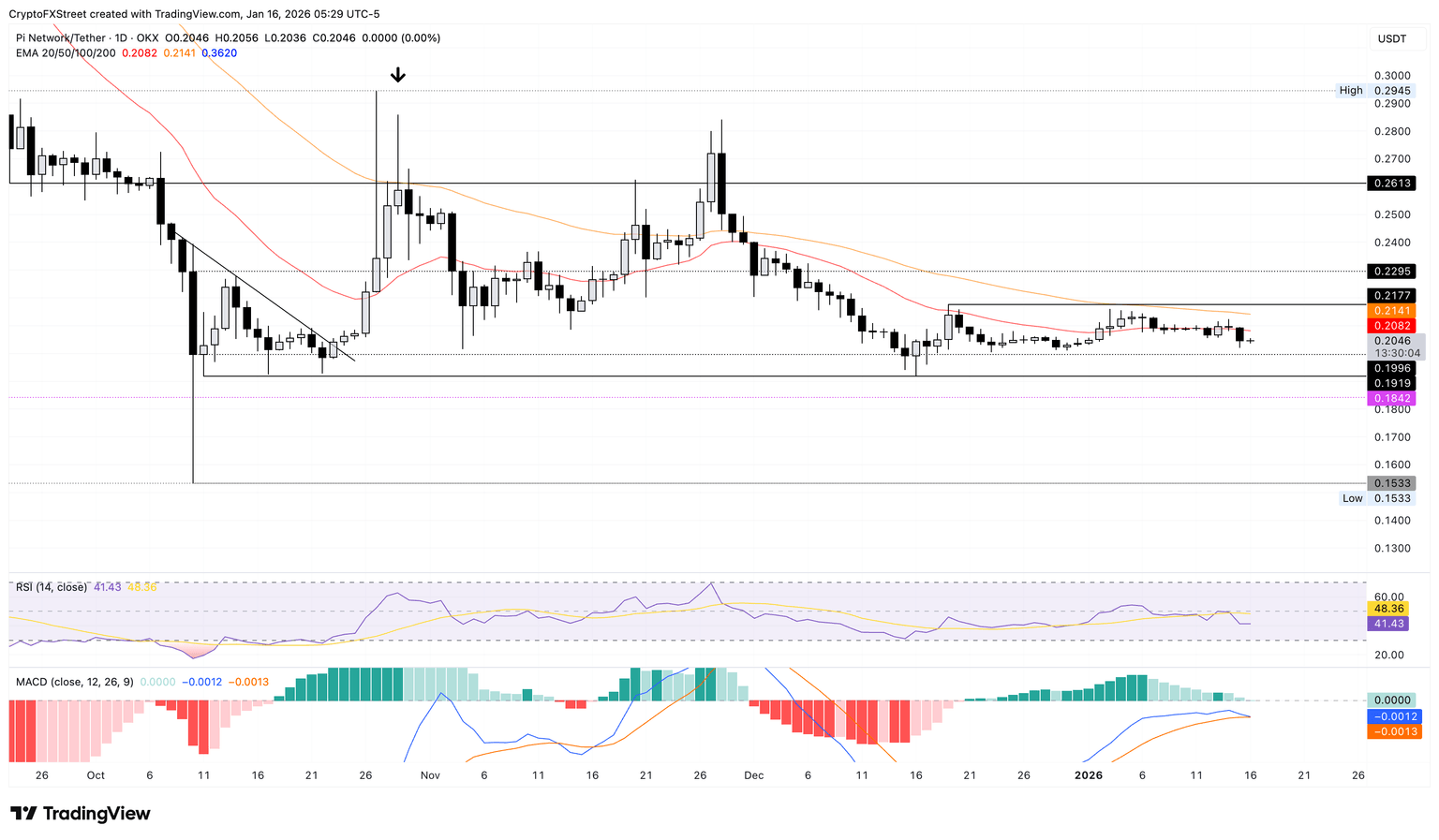 Pi Network (PI) se está negociando cerca del nivel de soporte psicológico de 0.2000$ en el momento de la publicación el viernes, extendiendo su consolidación de casi un mes. Los grandes depósitos en intercambios centralizados que aceptan tokens PI sugieren un sesgo de venta entre los tenedores. Técnicamente, Pi Network muestra un sesgo a la baja mientras el indicador MACD se acerca a un cruce bajista.