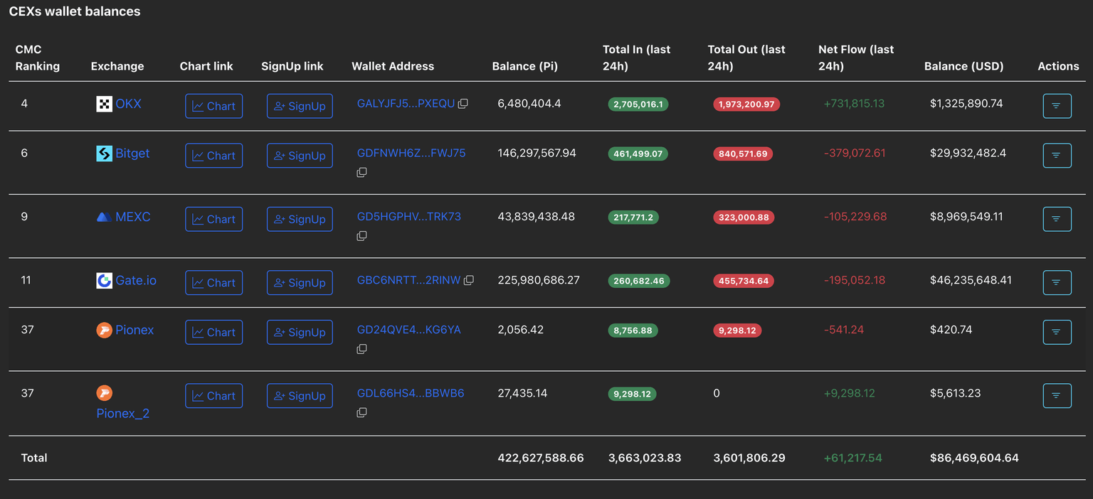 Los saldos de billetera en CEX han aumentado efectivamente en 61.217 tokens PI, con el intercambio OKX registrando la mayor entrada de 2.70 millones de tokens PI. Este aumento en las reservas de CEX podría reflejar una creciente presión de suministro potencial.