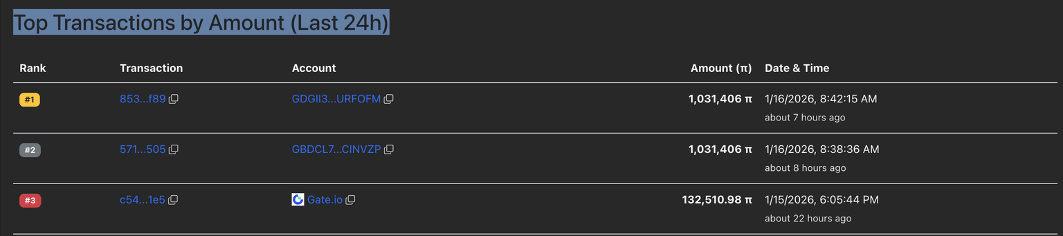 Los datos de PiScan muestran que dos de las tres transacciones más grandes en Pi Network en las últimas 24 horas involucraron depósitos de 1.03 millones de tokens PI. Esto sugiere una disminución en los tenedores de grandes carteras, confirmando una caída en el sentimiento.