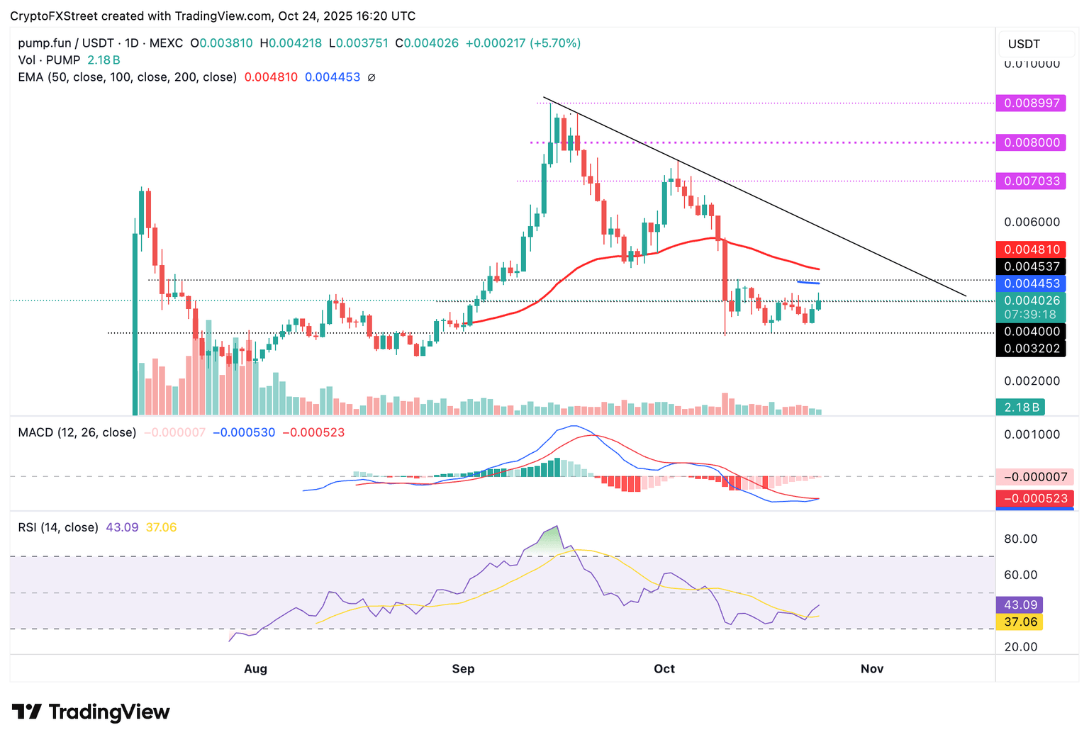 Pump.fun se cotiza por encima de 0.0040$, marcando el segundo día consecutivo de ganancias en medio de un sentimiento mejorado en el mercado de criptomonedas más amplio. El Índice de Fuerza Relativa (RSI) en tendencia ascendente en 42 indica un alivio del impulso bajista. La recuperación por encima de la línea media reafirma aún más la perspectiva alcista, aumentando las probabilidades de una tendencia alcista constante.