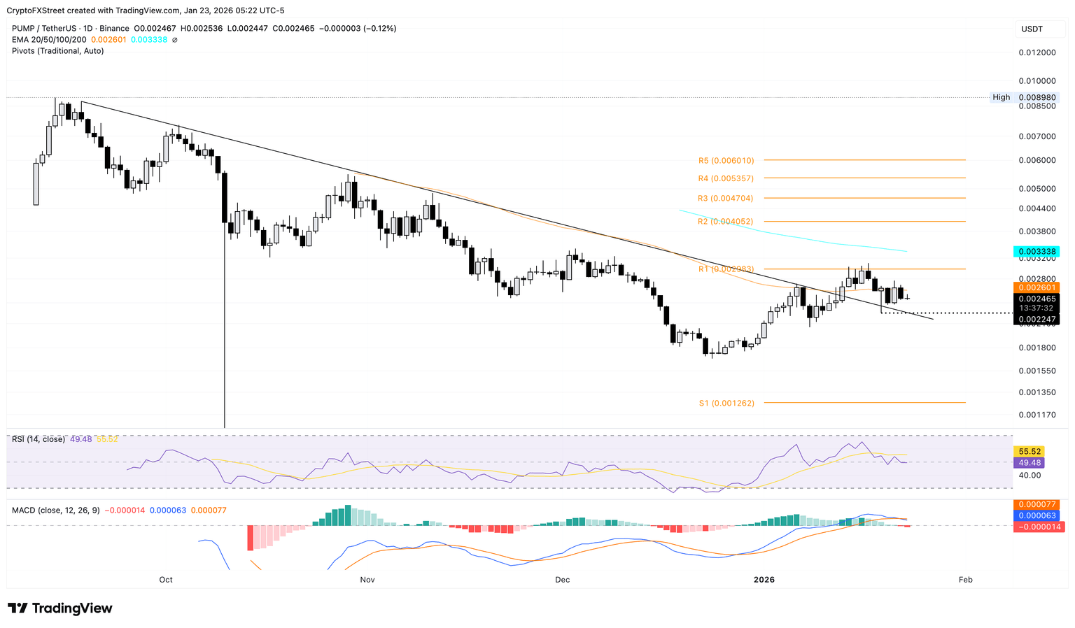 Si el token de la plataforma de lanzamiento basado en Solana cae por debajo del mínimo del 19 de enero en 0.002247$, expondría el soporte psicológico de 0.002000$ y el soporte más profundo cerca del mínimo del 24 de diciembre en 0.001678$.