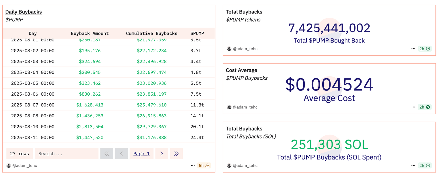 El equipo de Pump.fun aceleró su programa de recompra de tokens con casi 12 millones de dólares en PUMP retirados de circulación el martes. Según la plataforma de seguimiento del ecosistema de Finanzas Descentralizadas (DeFi) Dune, la actividad de un solo día impulsó las recompras acumulativas a 7.4 mil millones de PUMP valorados en 43.4 mil millones de dólares.