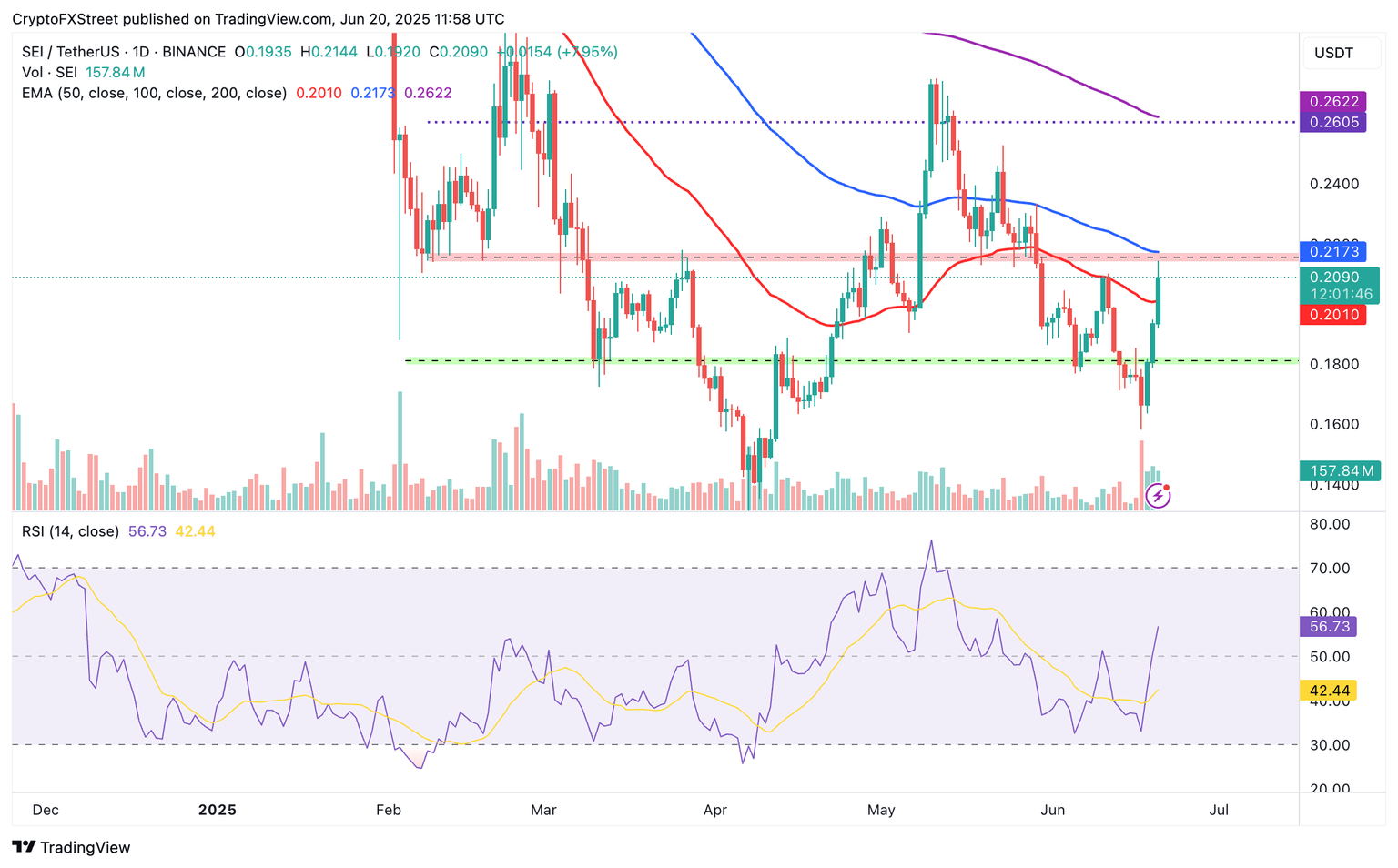 Sei extendió la tendencia alcista, alcanzando máximos intradía de 0.21$ mientras recuperaba la posición por encima de la media móvil exponencial (EMA) de 50 días, actualmente en 0.20$.