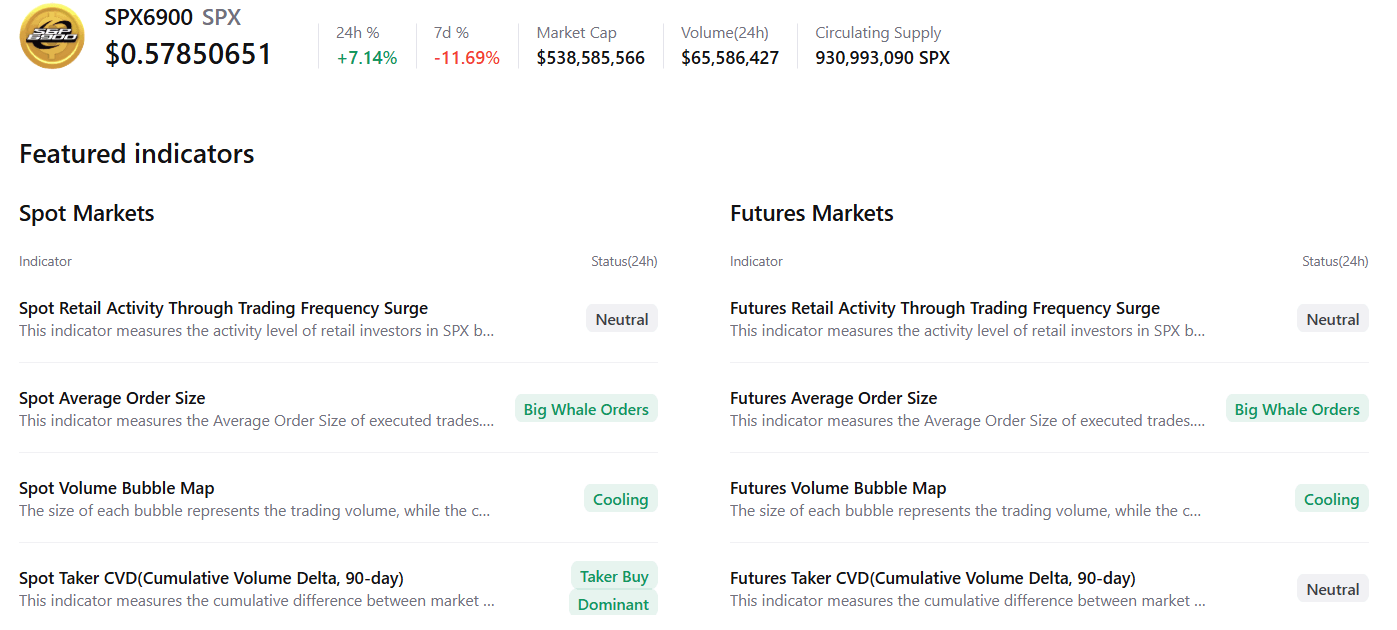 El precio de SPX6900 (SPX) se mantiene cerca de 0.58$ al momento de escribir el jueves después de rebotar desde una zona de soporte clave a principios de esta semana. Los datos en cadena y de derivados muestran condiciones de mercado en fortalecimiento, con un aumento en el volumen de operaciones, creciente actividad de ballenas y tasas de financiación positivas que sugieren un renovado impulso alcista. Mientras tanto, los indicadores técnicos también apuntan a una presión bajista en disminución, apoyando la posibilidad de una recuperación extendida en SPX.