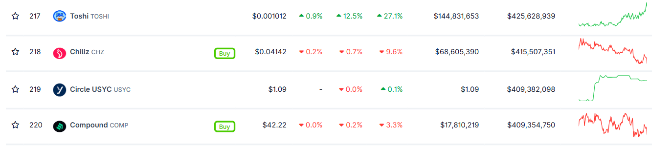 Los datos de CoinGecko a continuación muestran que la capitalización de mercado de Toshi alcanzó los 425.62 millones de dólares el jueves, superando a otras altcoins, como Chiliz (CHZ) y Compound (COMP), y asegurando el puesto 217 en la tabla de capitalización de mercado de criptomonedas en general.