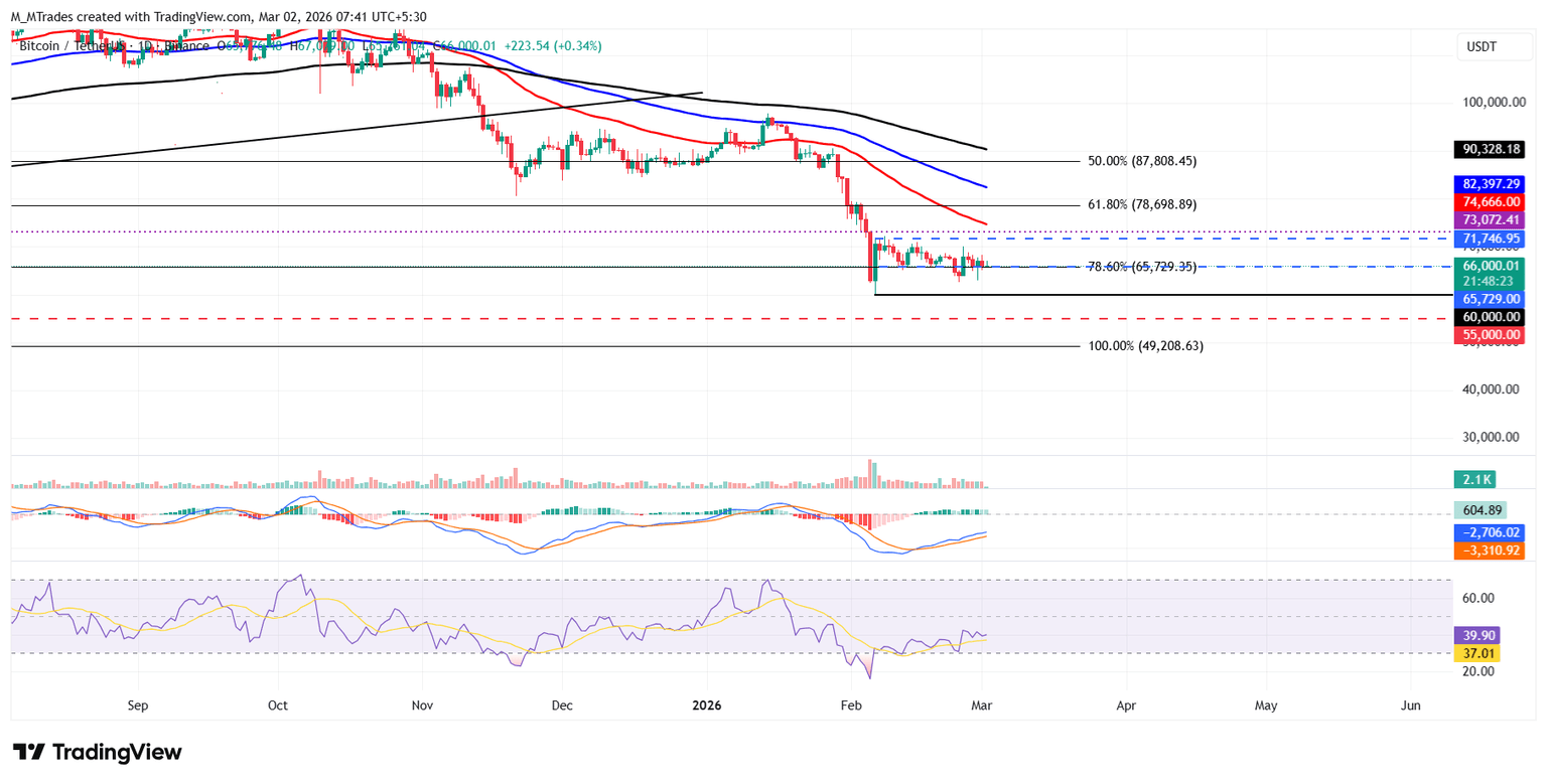 - El precio del Bitcoin se mantiene alrededor del rango de consolidación inferior en 65.729$, un cierre firme por debajo sugiere una corrección más profunda por delante