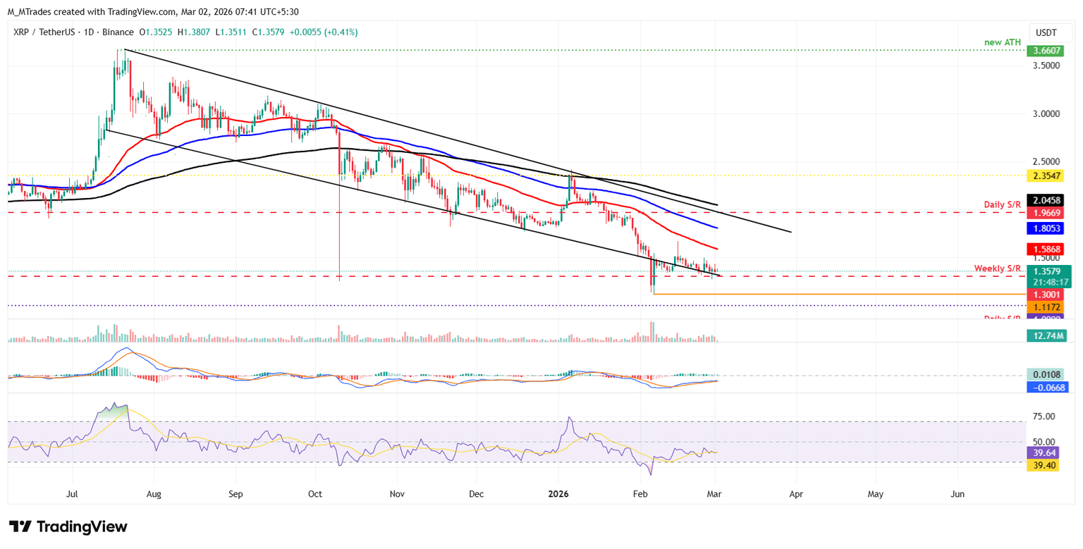 El precio de XRP ha estado encontrando soporte alrededor del límite inferior de la línea de tendencia de un cuña descendente desde la semana pasada. Esta línea de tendencia coincide aproximadamente con el nivel de soporte semanal en 1.30$, convirtiéndolo en una zona de soporte clave. Al momento de escribir el lunes, XRP continúa encontrando soporte alrededor de este nivel.