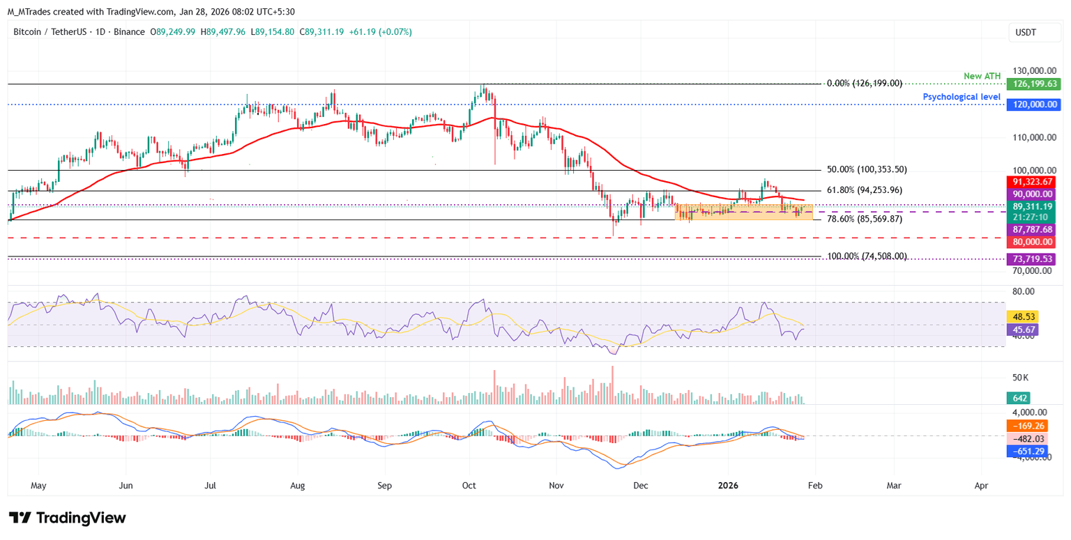 El precio del Bitcoin se recuperó ligeramente, cerrando por encima del punto medio de un canal paralelo horizontal en 87.787 $ el lunes, tras una corrección del 7.48% la semana pasada. BTC continuó su recuperación el martes, encontrando soporte alrededor del nivel medio. Al momento de escribir el miércoles, BTC se está negociando a 89.300 $.