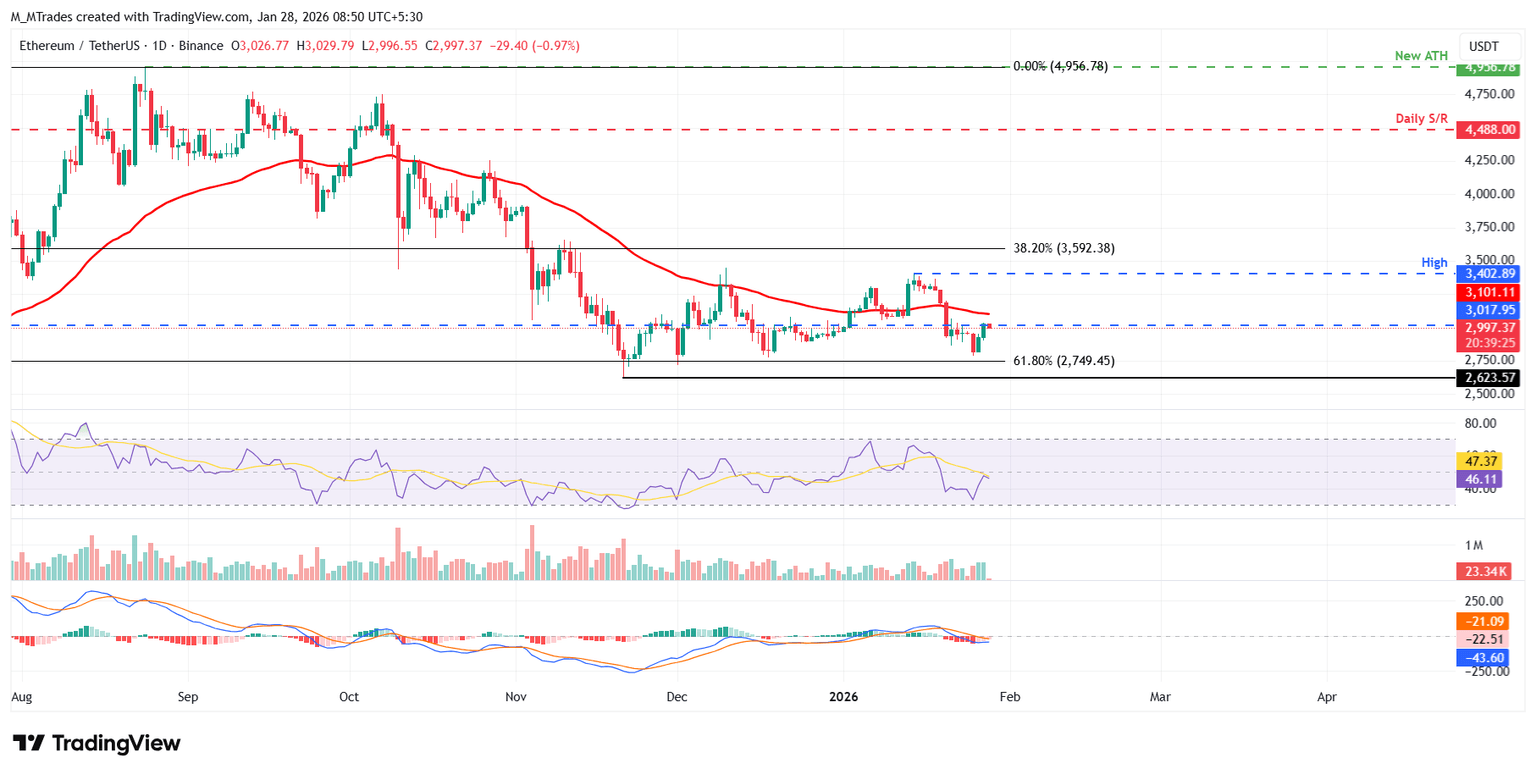 Si ETH rompe por encima de la resistencia diaria en 3.017 $ y cierra por encima de la media móvil exponencial (EMA) de 50 días en 3.101 $ de manera diaria, podría extender el rally hacia el máximo del 14 de enero en 3.402 $.