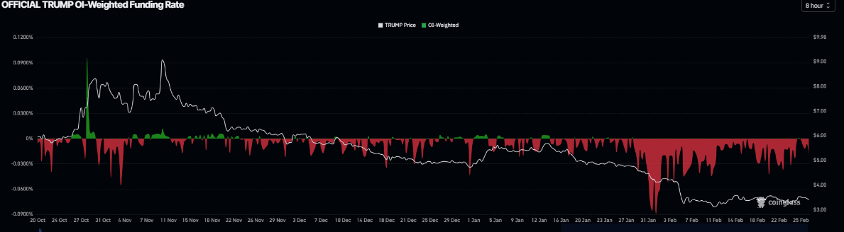 Los datos de derivados de TRUMP apoyan un sesgo bajista. La tasa de financiación de la moneda meme se volvió negativa el miércoles y se sitúa en -0.019% el viernes, según CoinGlass. La métrica negativa sugiere que los cortos están pagando a los largos, lo que indica un sentimiento bajista hacia Official Trump.