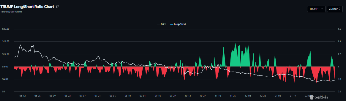 Además, la relación larga-corta de TRUMP se sitúa en 0.78 el viernes, acercándose a su nivel más bajo en más de un mes. Esta relación por debajo de 1 indica un sentimiento bajista, ya que los traders están apostando a que el precio de la moneda meme caerá.