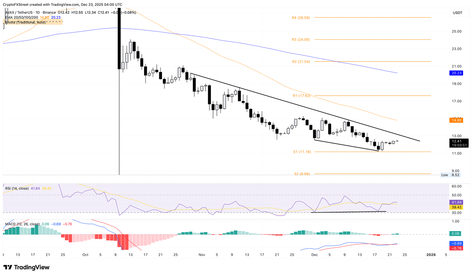 Avalanche (AVAX) cotiza por encima de 12,00$ en el momento de la publicación el martes, tras un aumento del 2% el día anterior. El token de la blockchain de capa 1 muestra signos de recuperación, con direcciones activas alcanzando un récord mensual en diciembre, y los inversores de grandes carteras, comúnmente conocidos como ballenas, están respaldando el renovado sentimiento de riesgo en el mercado de derivados. Técnicamente, AVAX se eleva dentro de un patrón de cuña descendente, con los toros apuntando a una posible recuperación.