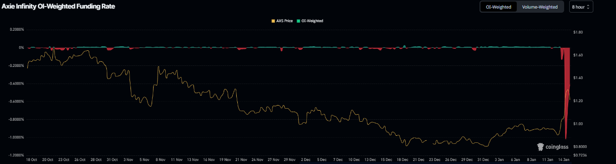 En el lado de los derivados, los datos apoyan aún más un sentimiento bajista entre los operadores de AXS. Los datos de tasa de financiación ponderada por OI de Coinglass muestran que el número de operadores que apuestan a que el precio de AXS caerá más es mayor que aquellos que anticipan un aumento del precio.