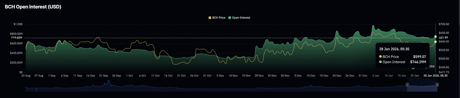Bitcoin Cash está presenciando signos tempranos de participación minorista, alineándose con la recuperación observada hasta ahora esta semana. Típicamente, una alineación de tasas de financiamiento positivas y un aumento en el interés abierto (OI) señala un mayor potencial alcista para un activo. Los datos de CoinGlass muestran un aumento en el interés abierto de futuros de BCH (OI) a 746.29 millones de dólares, desde 700.06 millones de dólares el martes, indicando una mayor exposición al riesgo a medida que los inversores anticipan más ganancias.