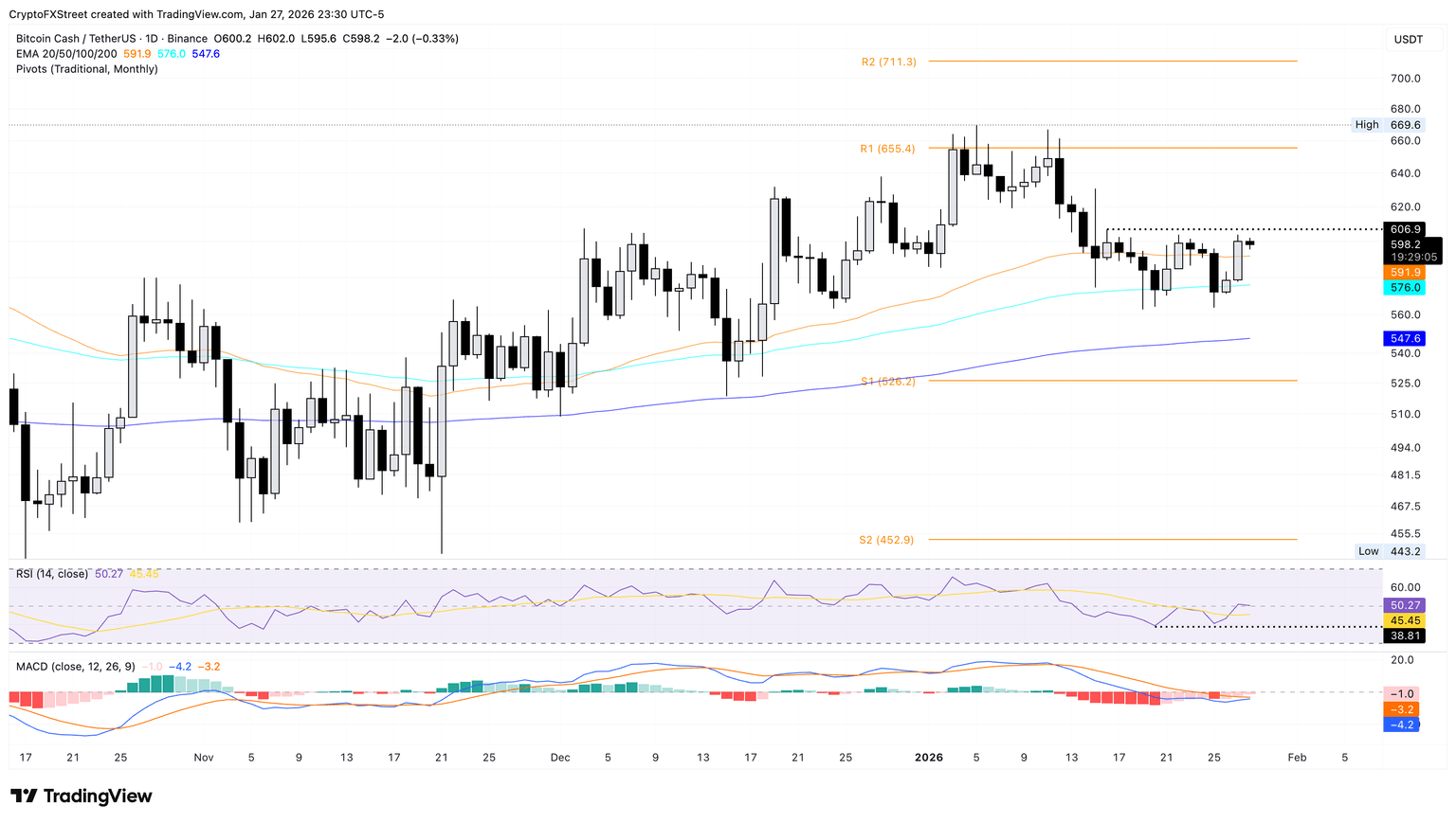 Bitcoin Cash se está negociando alrededor de 600$, manteniéndose por encima de la media móvil exponencial (EMA) de 50 días, que ahora está por encima de las EMAs de 100 y 200 días, sugiriendo una tendencia alcista a largo plazo. Los rebotes desde la EMA de 100 días en 575$ forman un patrón de doble suelo en el gráfico de precios diario de BCH con la línea de cuello en el máximo del 16 de enero de 606$.