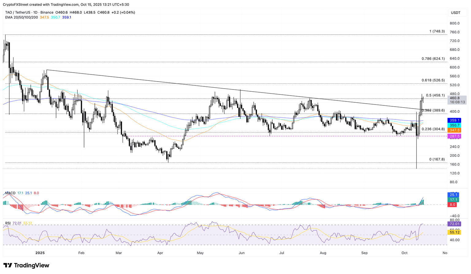 Mirando hacia abajo, si TAO retrocede desde el nivel de 458$, podría volver a probar el nivel de retroceso de Fibonacci del 38.2% en 389$, amenazando el nivel psicológico de 400$.