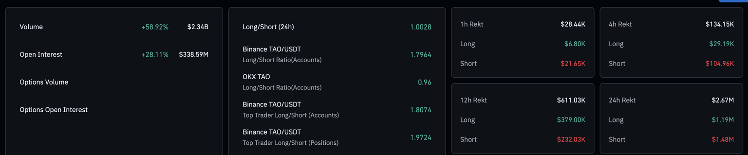 El sentimiento de los operadores en torno a Bittensor en el mercado de derivados ha vuelto a niveles elevados tras el desplome del viernes. Los datos de CoinGlass muestran que el Interés Abierto (OI) de futuros de TAO se sitúa en 338,59 millones$, con un aumento del 28% en las últimas 24 horas. Este aumento de dos dígitos se refiere a un incremento en el valor nocional de los contratos de futuros pendientes, señalando que los operadores están aumentando su exposición al riesgo.