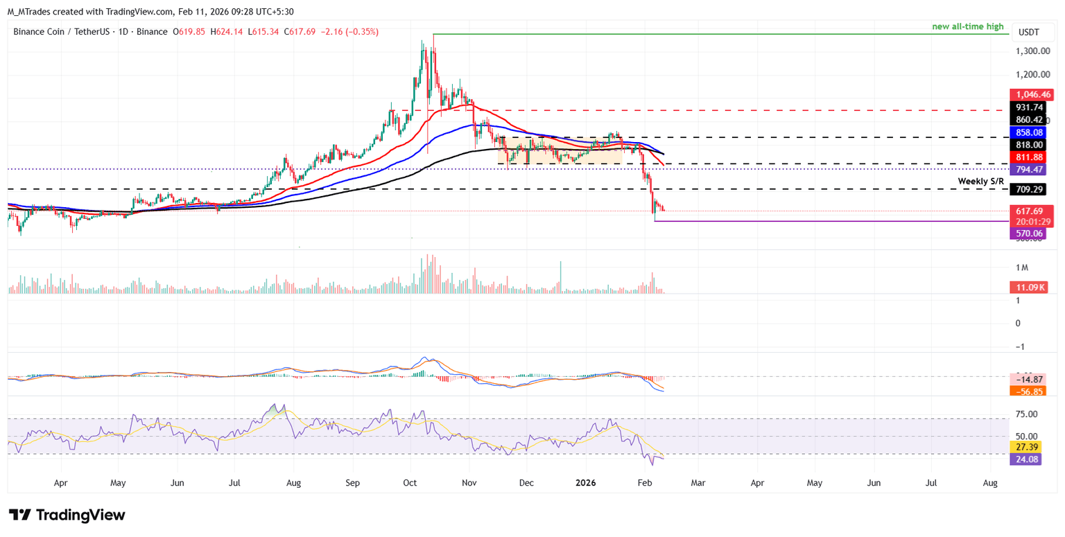 El precio de BNB corrigió bruscamente la semana pasada, alcanzando un mínimo de 570.06$ el viernes antes de recuperarse ligeramente, luego reanudó su caída, cerrando la semana con una pérdida del 15.64%. BNB extiende su retroceso, deslizándose casi un 4% hasta el miércoles.
