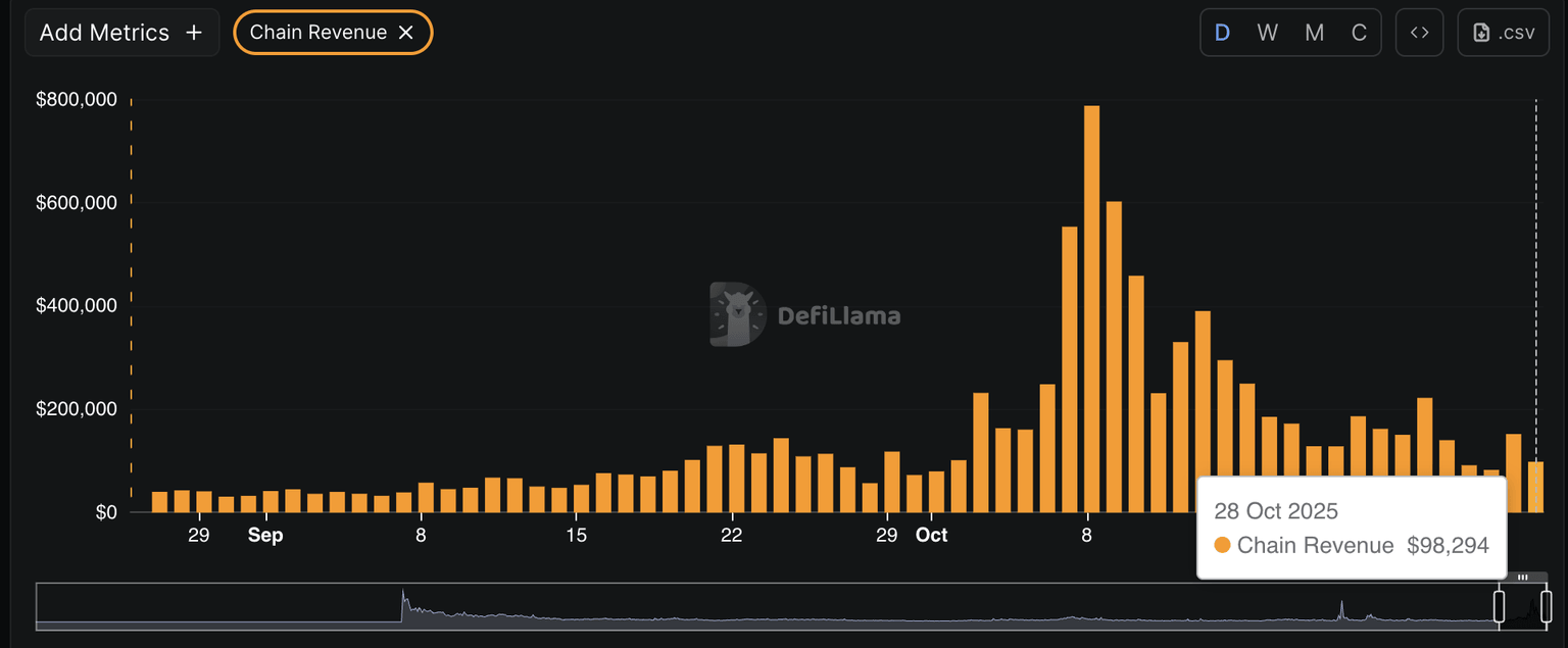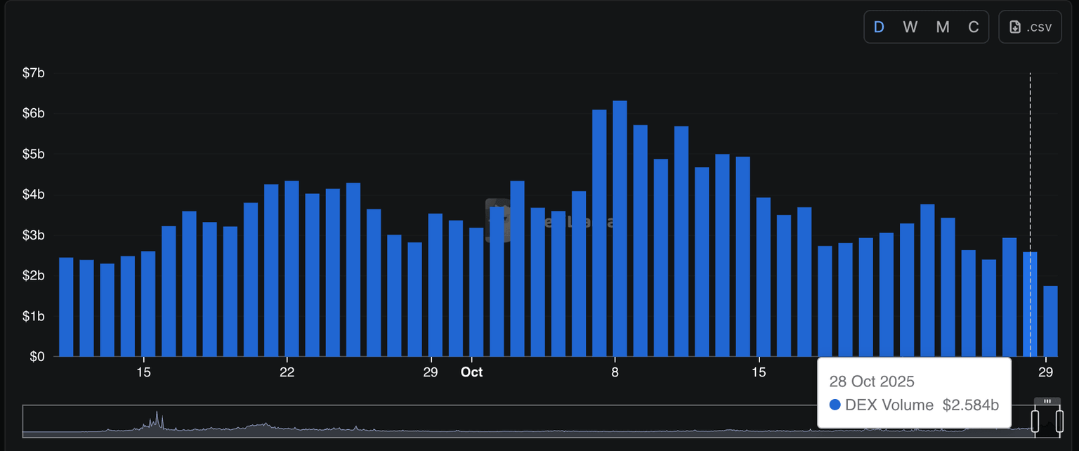 Según DeFiLlama, el volumen de los intercambios descentralizados (DEXs) ha caído a 2.584 millones de dólares el martes, desde el máximo de 6.313 millones de dólares del 8 de octubre, indicando una baja liquidez en la cadena.