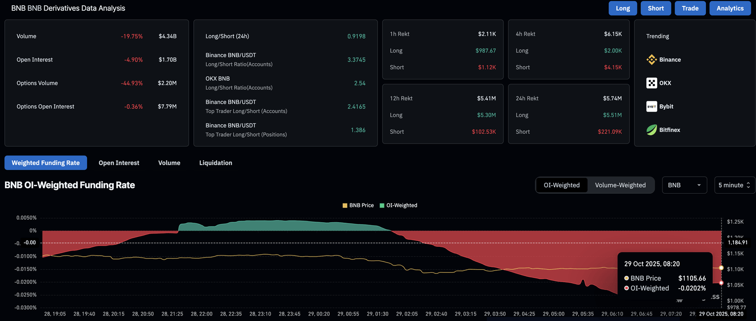 Anticipando más pérdidas, la demanda minorista de BNB ha disminuido significativamente en el mercado de derivados. Los datos de CoinGlass muestran una caída del 4.90% en el interés abierto de futuros de BNB (OI) en las últimas 24 horas a 1.70 mil millones de dólares, lo que sugiere que los operadores están reduciendo su exposición o el apalancamiento de sus posiciones.