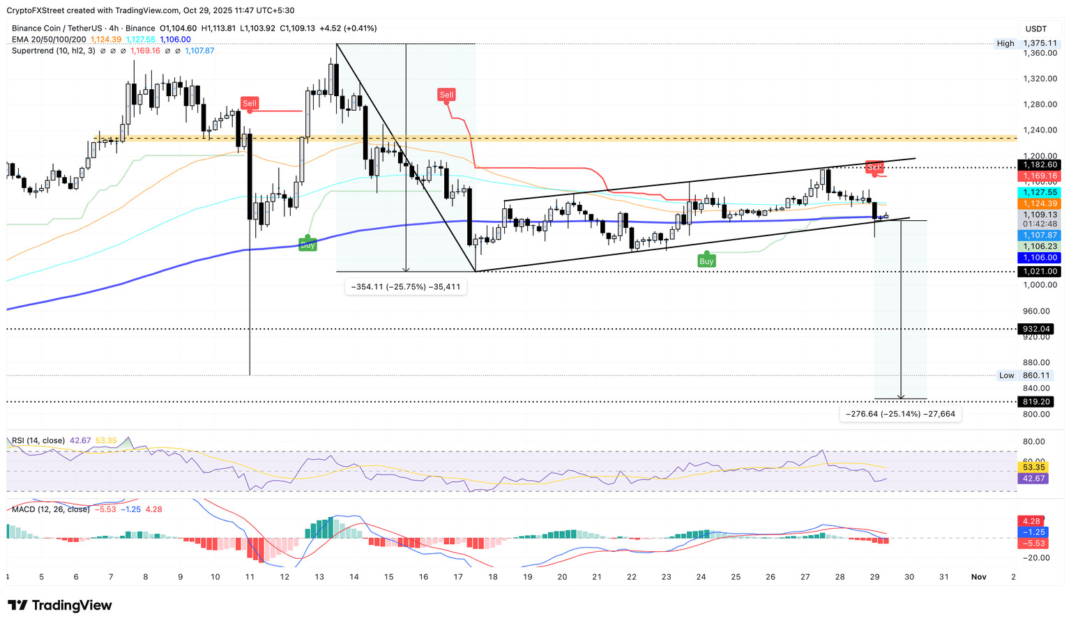 Si BNB cae por debajo de 1.100$, confirmaría la ruptura a la baja de la bandera bajista. En tal caso, los niveles de soporte clave son 1.021$, 932$, 860$ y 819$, marcados por los mínimos del 17 de octubre, 26 de septiembre, 10 de octubre y 16 de agosto en el gráfico de 4 horas. Este último nivel coincide aproximadamente con el objetivo del patrón gráfico de bandera bajista.