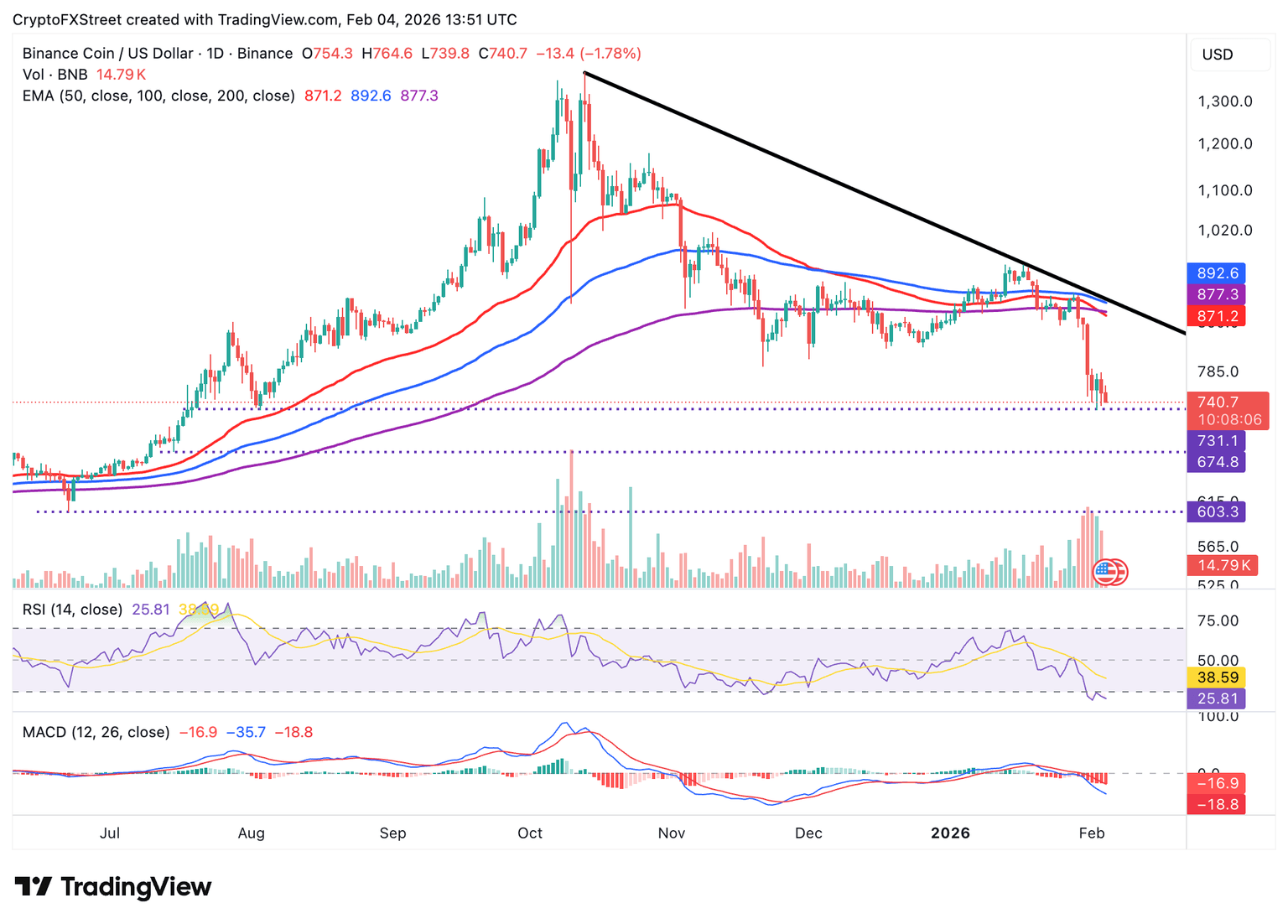 BNB está extendiendo su declive por debajo de 750$, presionado por la baja actividad minorista como se mencionó anteriormente y una estructura técnica débil. La media móvil exponencial (EMA) de 50 días en 871$ ha cruzado recientemente por debajo de la EMA de 200 días en 877$, formando un Patrón de Cruz de la Muerte, lo que enfatiza la perspectiva bajista.