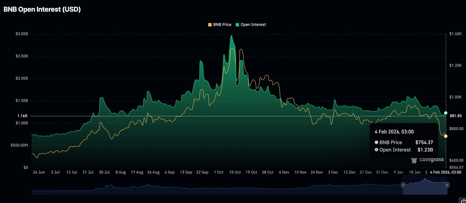 El interés minorista en BNB sigue siendo relativamente bajo a pesar de un ligero aumento a 1.230 millones$ el miércoles, desde 1.190 millones$ el día anterior. En contraste, el Interés Abierto (OI) de futuros se disparó a 2.970 millones$ el 8 de octubre antes de que BNB alcanzara su máximo histórico el 13 de octubre.