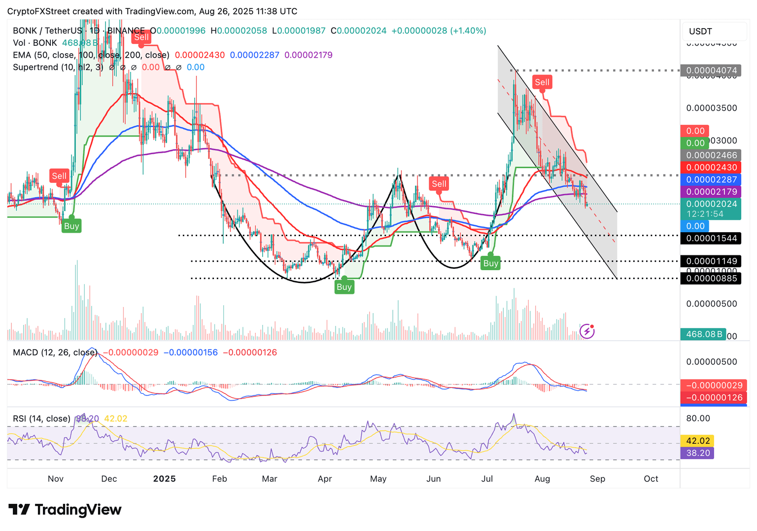 El precio de Bonk se mantiene por encima del soporte a corto plazo en 0.000020$, que coincide con el límite medio de un canal descendente. A pesar de imprimir la primera vela verde tras tres días consecutivos de caídas, múltiples indicadores técnicos muestran señales bajistas.