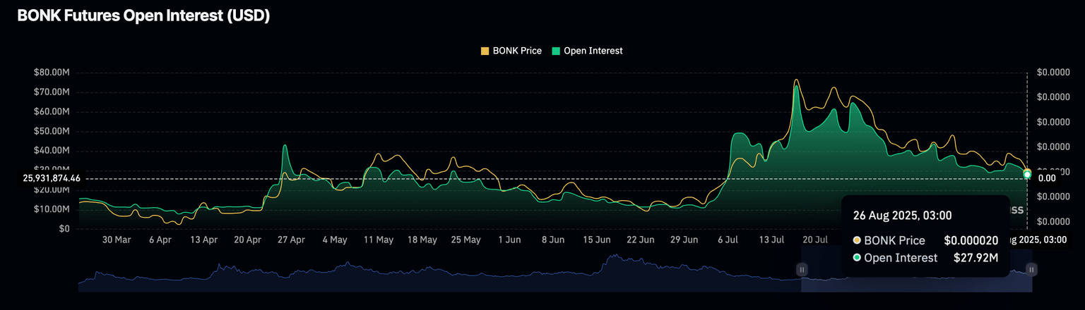 Bonk ha mantenido una tendencia bajista general desde su máximo local de julio, con intentos de recuperación volviéndose cada vez más difíciles de sostener. Una mirada al interés abierto (OI) del mercado de derivados, que representa el valor de los contratos de futuros u opciones pendientes, destaca un sentimiento adverso al riesgo persistente.