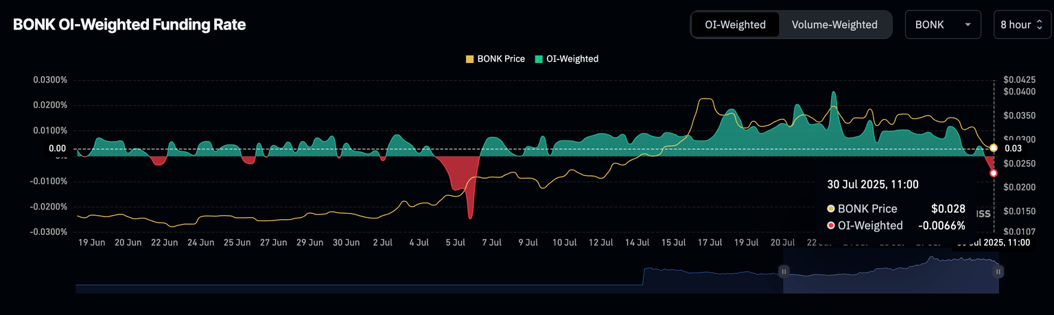 La tasa de financiación ponderada de futuros también ha estado en un descenso constante a -0.0066% después de alcanzar un pico de 0.0256% el 23 de julio. Las tasas de financiación bajas o negativas indican un sentimiento alcista débil, ya que pocos operadores apuestan a que el precio de Bonk aumente. Al mismo tiempo, la caída sugiere una falta de confianza en el ecosistema, o una disminución de la actividad especulativa, lo que podría dejar a Bonk susceptible a presiones a la baja.