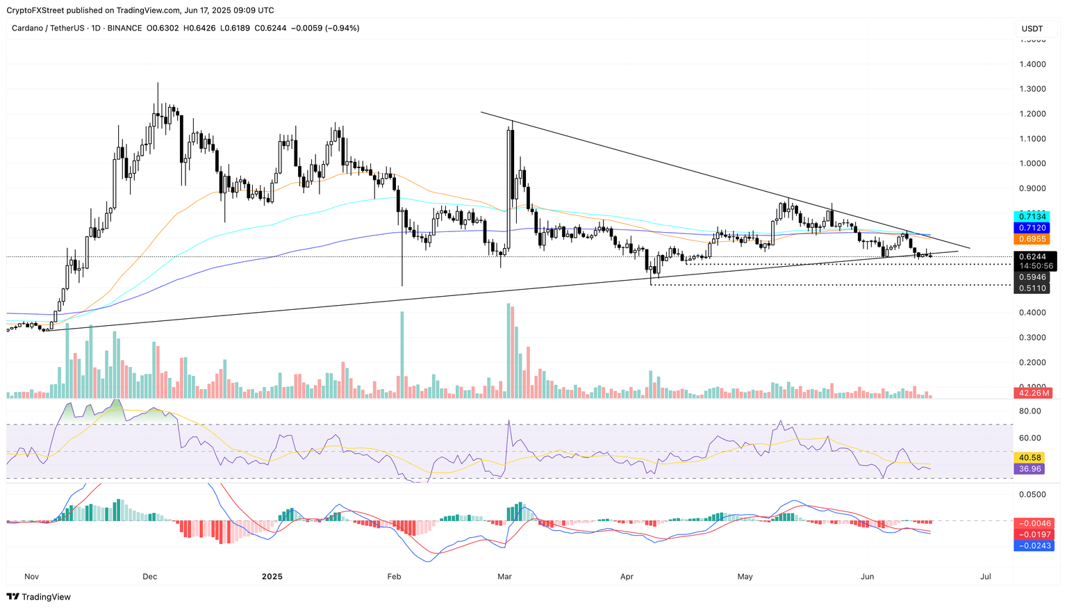 El giro bajista de Cardano desde la media móvil exponencial (EMA) de 200 días en 0.7120$ representó una caída del 5.50% la semana pasada. La caída se extiende a más del 1% hasta ahora esta semana, rompiendo por debajo de una línea de tendencia de soporte formada por los mínimos del 5 de noviembre, 9 de abril y 5 de junio en el gráfico diario.