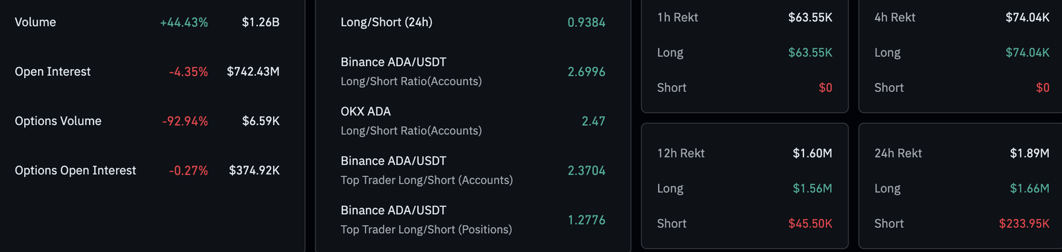 Los datos de CoinGlass muestran una caída repentina en el Interés Abierto (OI) de Cardano del 4.35% en las últimas 24 horas, alcanzando los 742 millones. La masiva eliminación de capital en OI señala un gran retiro por parte de los traders para evitar un aumento de la volatilidad. También se relaciona con una disminución en la presión de compra.