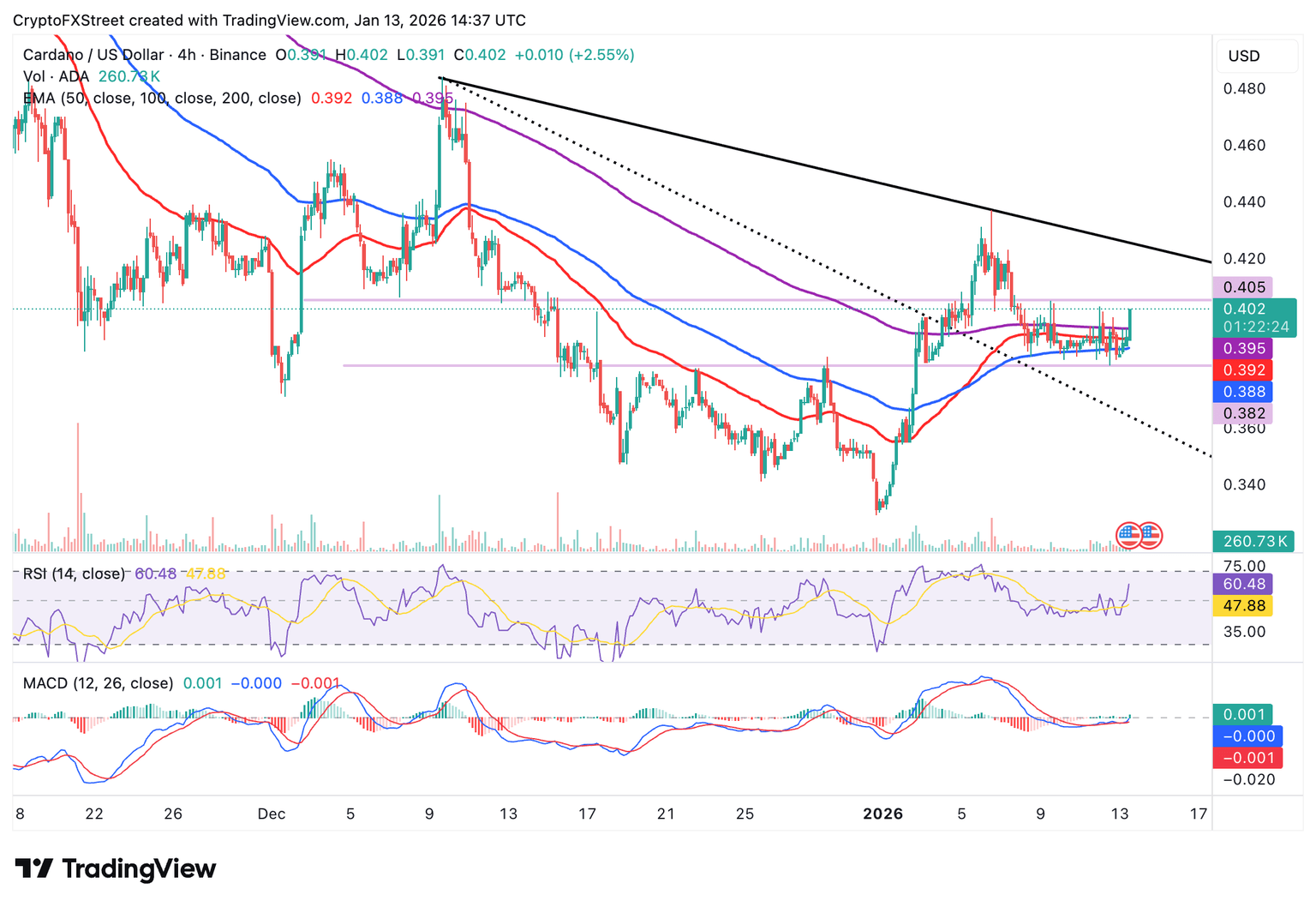 Cardano sube por encima de 0.40$ en el momento de escribir el martes, apoyado por un sentimiento positivo impulsado por una inflación en EE.UU. más suave. El token también se mantiene por encima de las Medias Móviles Exponenciales (EMAs) de 100 y 50, que están listas para proporcionar soporte a corto plazo alrededor de 0.39$.