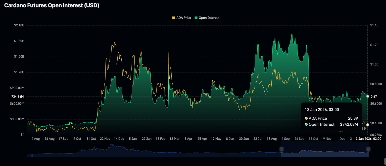 Mientras tanto, el interés minorista en Cardano ha permanecido significativamente bajo desde el colapso repentino del 10 de octubre, con intentos de recuperación rápidamente apagados. Los datos de CoinGlass muestran que el interés abierto de futuros (OI) promedió 742 millones de dólares el martes, por debajo de los 780 millones de dólares del lunes y 844 millones de dólares del 5 de enero.