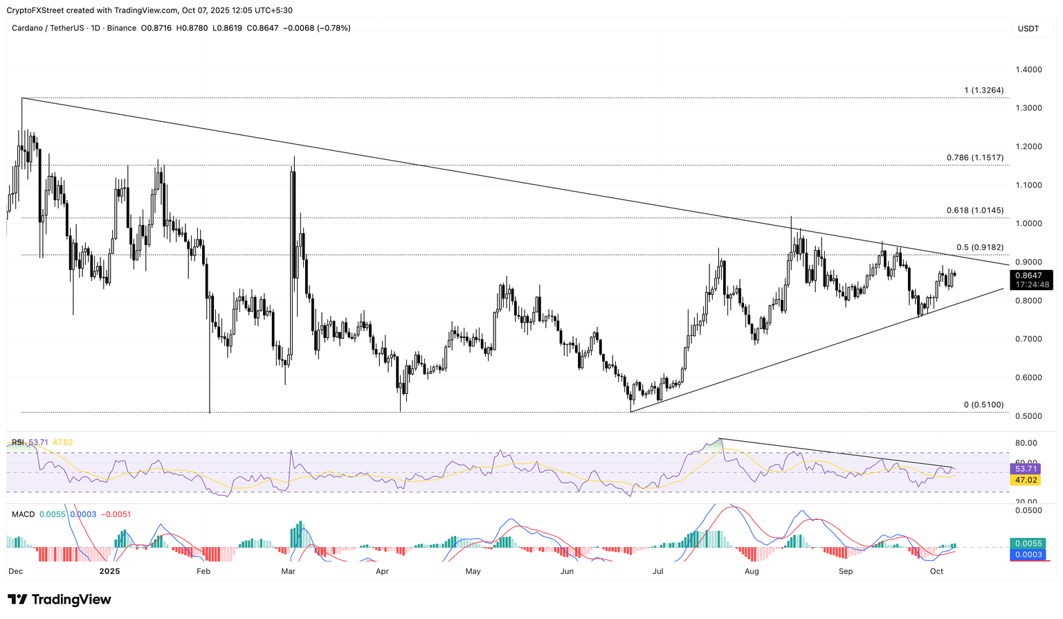 Técnicamente, Cardano se acerca al ápice de un patrón de triángulo simétrico en el gráfico diario, manteniendo la situación en un punto crítico.