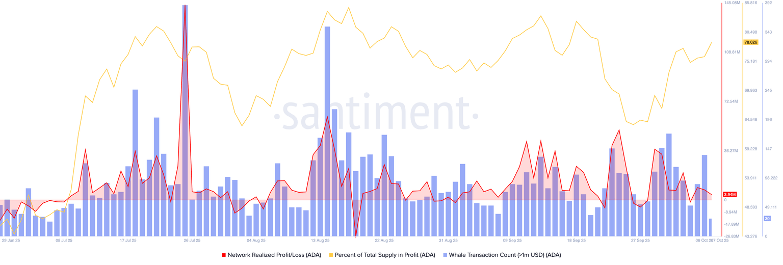 La racha de toma de beneficios de los inversores se ha estado enfriando en las últimas semanas, aliviando la presión de venta. Los datos de Santiment muestran que el indicador de Beneficio/Pérdida Realizado en la Red (NRPL) ha hecho picos más bajos tras la toma de beneficios de 51.57 millones de ADA el 24 de septiembre. Una disminución en la racha de toma de beneficios indica que los inversores están inclinándose hacia mantener o potencialmente adquirir más ADA, lo que señala una mayor confianza en el token.