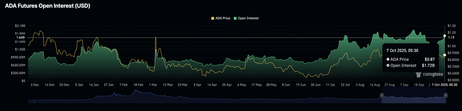 Mientras tanto, la demanda minorista también está creciendo en los derivados de ADA, ya que los datos de CoinGlass revelan que el Interés Abierto de Futuros de Cardano (OI) ha aumentado más del 5% en las últimas 24 horas, alcanzando 1.72 mil millones. Una recuperación repentina en el OI implica un aumento en las posiciones largas que se han acumulado a medida que los operadores anticipan más ganancias.