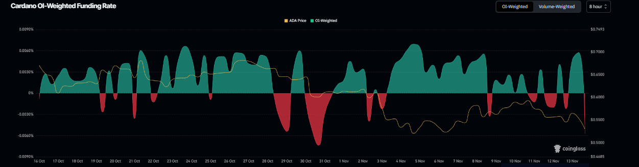 Los datos de derivados para Cardano apoyan una perspectiva bajista. Los datos de la Tasa de Financiación Ponderada por OI de Coinglass muestran que el número de traders que apuestan a que el precio de ADA caerá más es mayor que aquellos que anticipan un aumento en el precio.