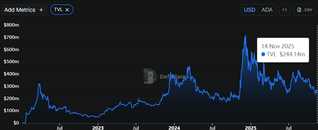 Los datos de DefiLlama muestran que el TVL de Cardano cayó a 244.14 millones de dólares el viernes y ha estado disminuyendo constantemente desde mediados de agosto. La caída del TVL señala una actividad debilitada y un compromiso de usuario menguante en el ecosistema de Cardano, lo que implica que menos participantes están depositando o interactuando con los protocolos basados en ADA, lo que no augura nada bueno para su precio.