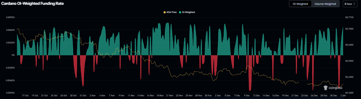 Además, los datos de la tasa de financiación de Cardano indican un potencial repunte. Según los datos de la Tasa de Financiación Ponderada por OI de Coinglass, el número de operadores que apuestan a que el precio de Cardano caerá más es menor que aquellos que anticipan un aumento de precio.