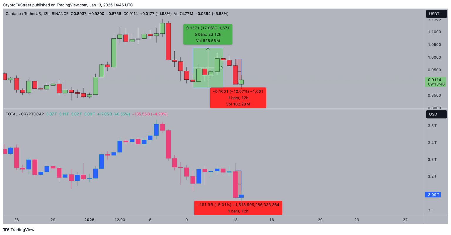 El precio de Cardano se desplomó un 10% el lunes, cayendo desde su precio de apertura de 0.99$ hasta 0.91$ en el momento de la publicación.