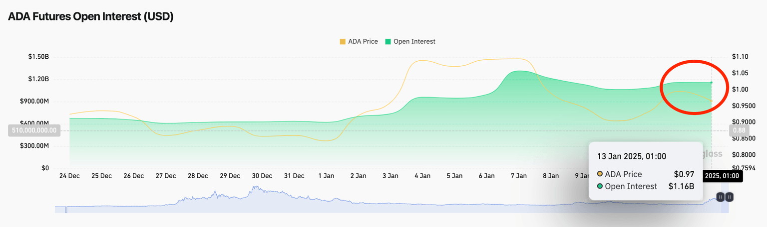 El interés abierto estable de 1.16 mil millones de dólares en derivados de ADA ilustra que los operadores están adoptando un enfoque defensivo pero optimista. Con la inauguración de Trump a solo unos días, muchos parecen estar anticipando un posible rebote del mercado, particularmente si se materializan las enmiendas políticas favorables a las criptomonedas propuestas.